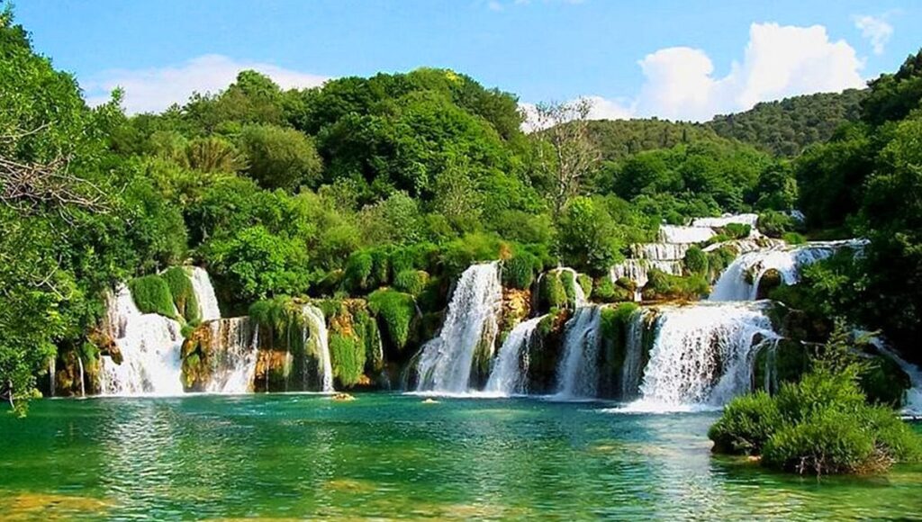 Krka is just over an hour from Split and features swimming pools with clear water, lakes, cascading waterfalls, and lush forests surrounding it. Wineries and nature also surround it.